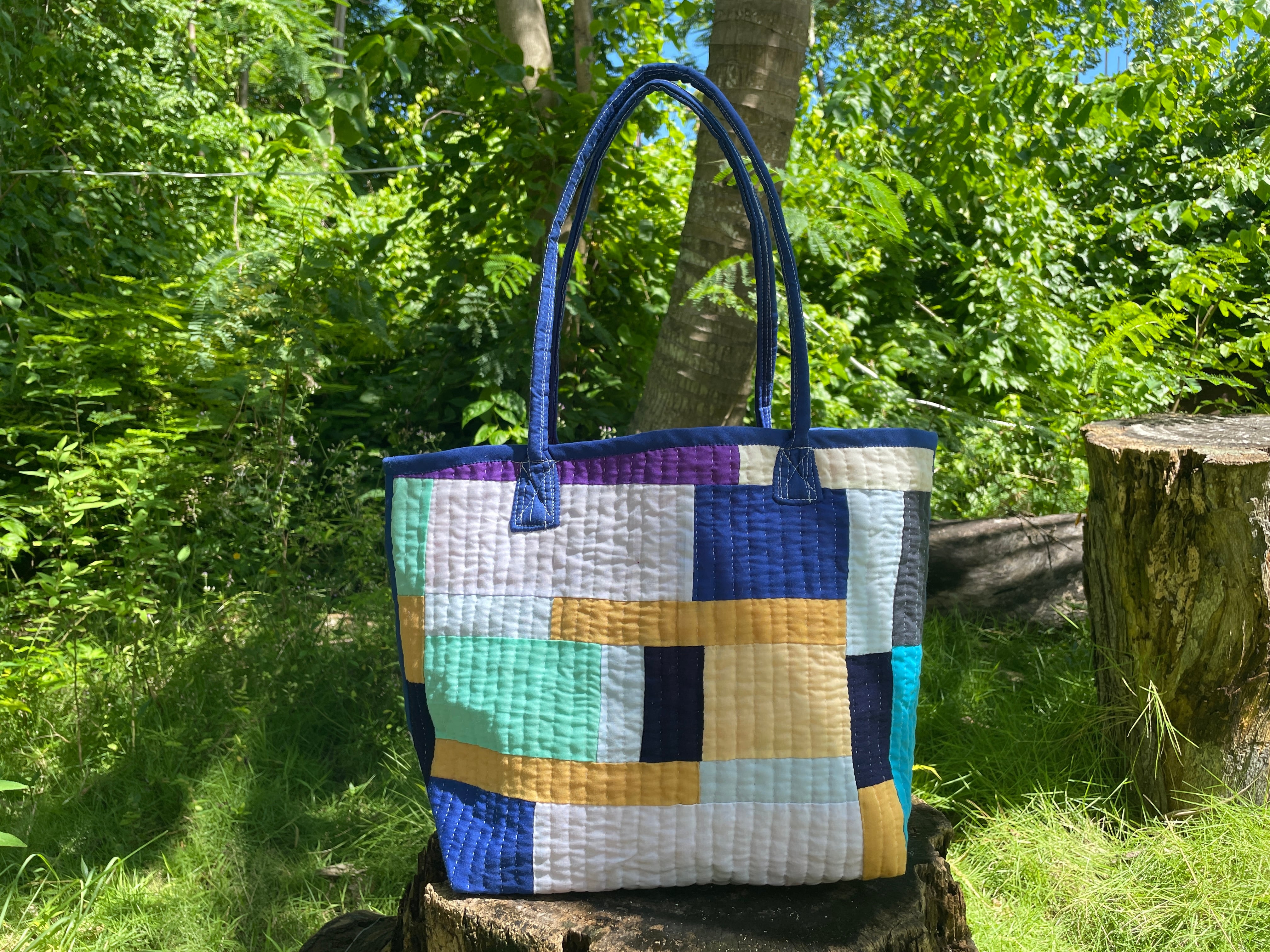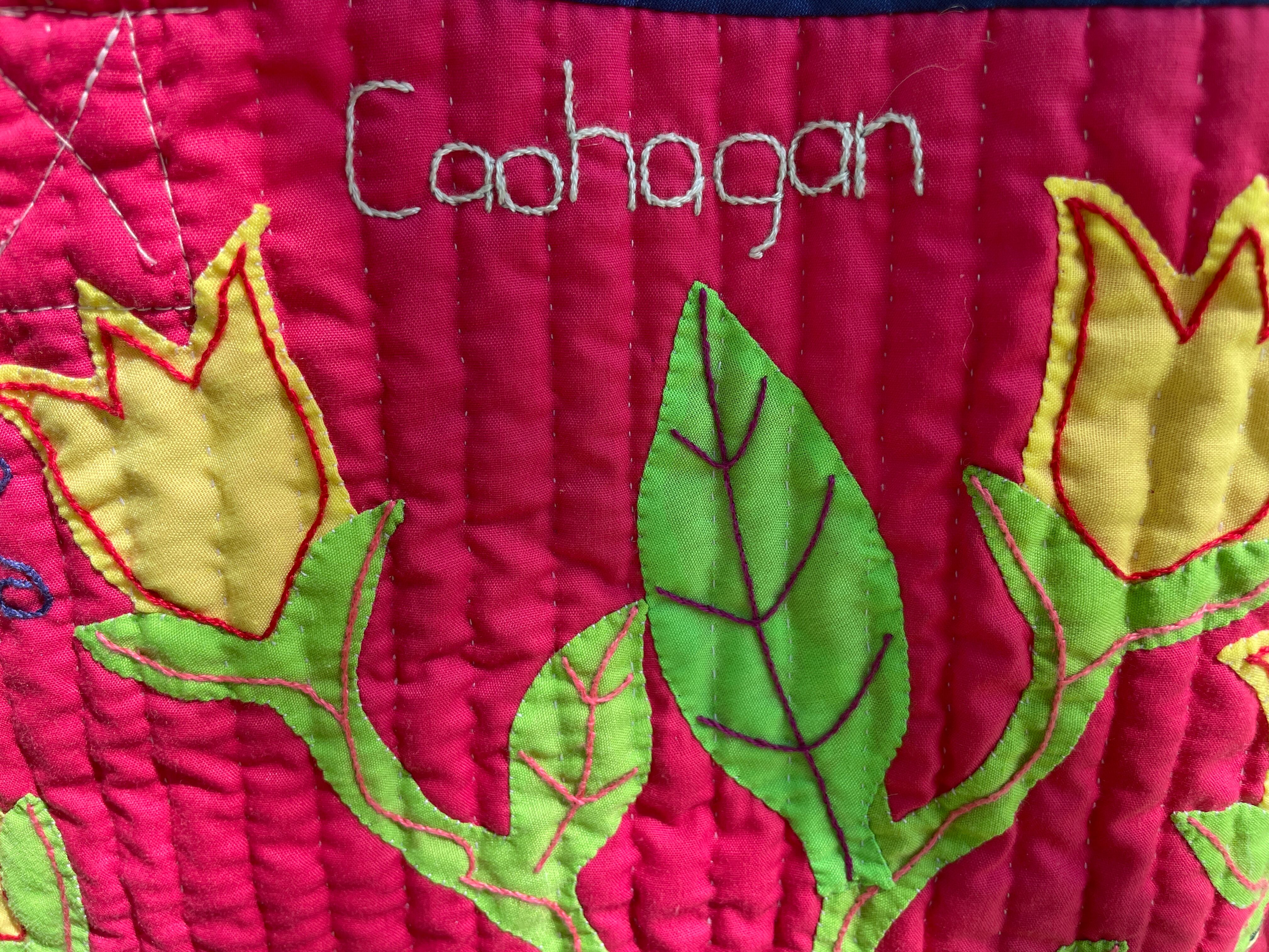 表面はカオハガンキルト、裏面はカラフルな生地を組み合わせたピースワークで仕上げています。リバーシブルとしてお使いいただけるので、気分やコーディネートによってお楽しみいただけます。