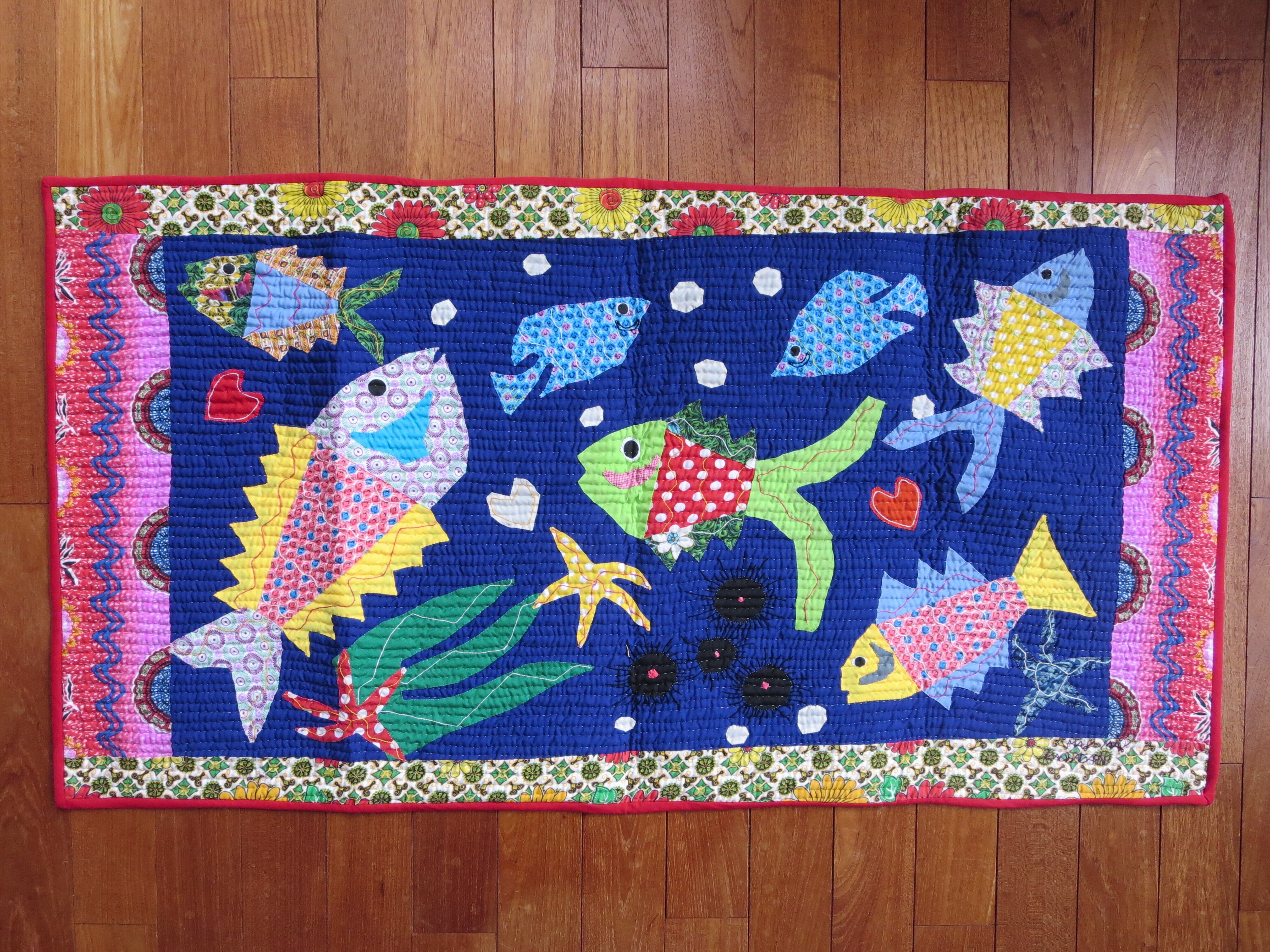 カオハガン島の海には魚、ヒトデ、ウニなどのたくさんの生きものが共存しています。その恵みをいただき、島民たちは生きています。海のキルトは、彼女たちが最も得意なモチーフのひとつです。