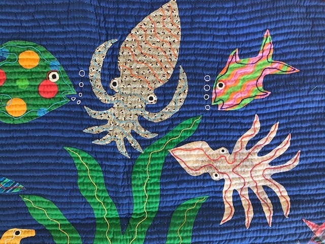 キルトの先生であるマティアの作品はなかなかお目にかかることができません。普段は、キルターたちのキルトをカットしたり、アドバイスしたり、生地の管理をしたりと大忙しだからです。そんなマティアに海のキルトをつくってもらうようにお願いしました。いろんな生きものが海の中で生きている様子が楽しいキルトです。